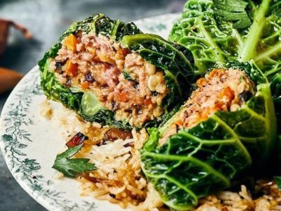 Petites feuilles de choux verts farcies à l’agneau, riz aux oignons caramélisés