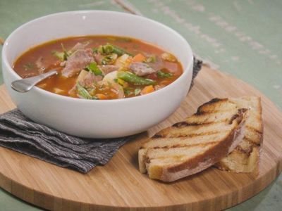 - Répartir la soupe dans les bols. Parsemer des croûtons aillés, de cerfeuil, de copeaux de parmesan et d’un tour de moulin à poivre. Déposer les lamelles d’agneau et déguster.